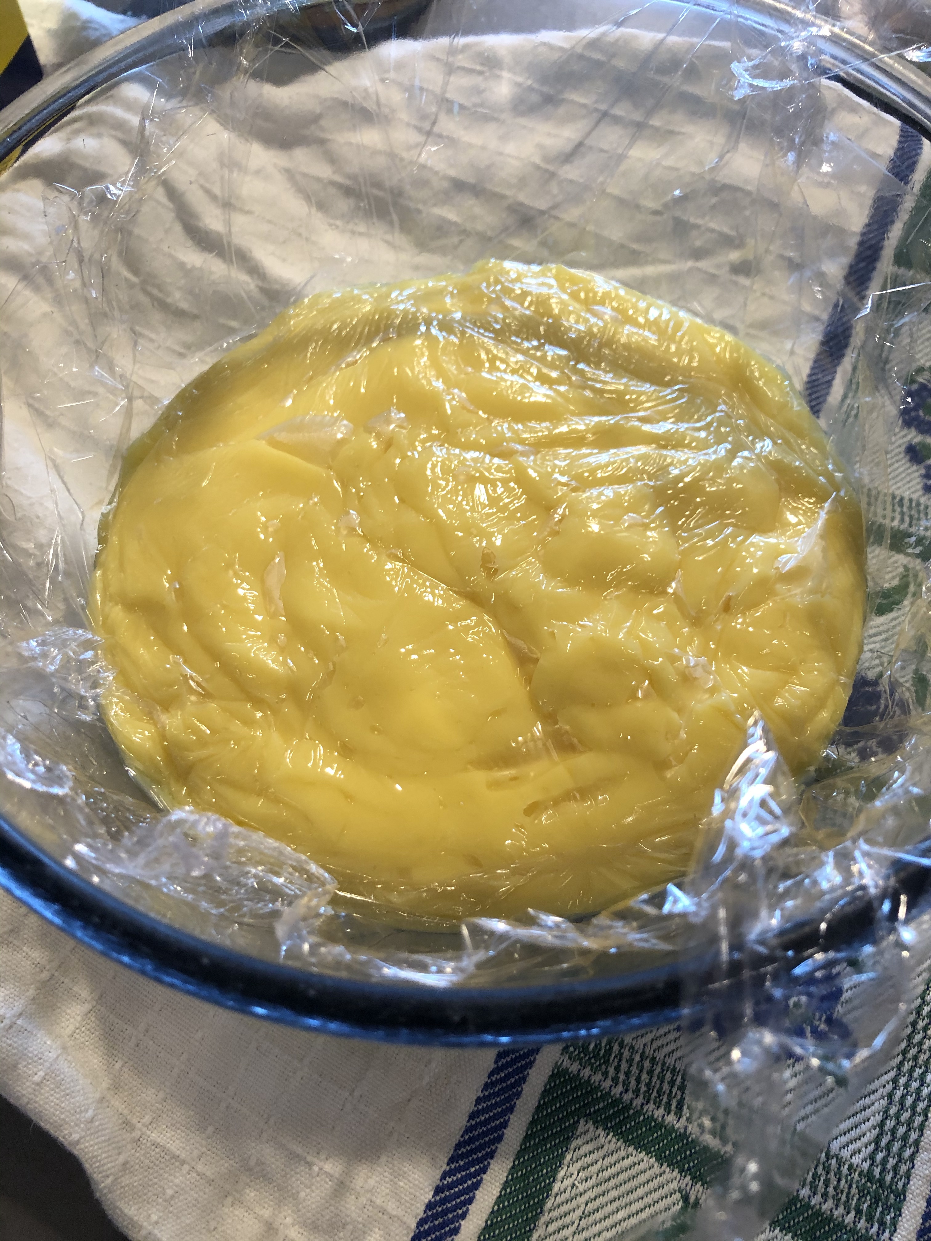 Verso la crema in una ciotola, copro con la pellicola a contatto e ripongo in frigorifero a raffreddare