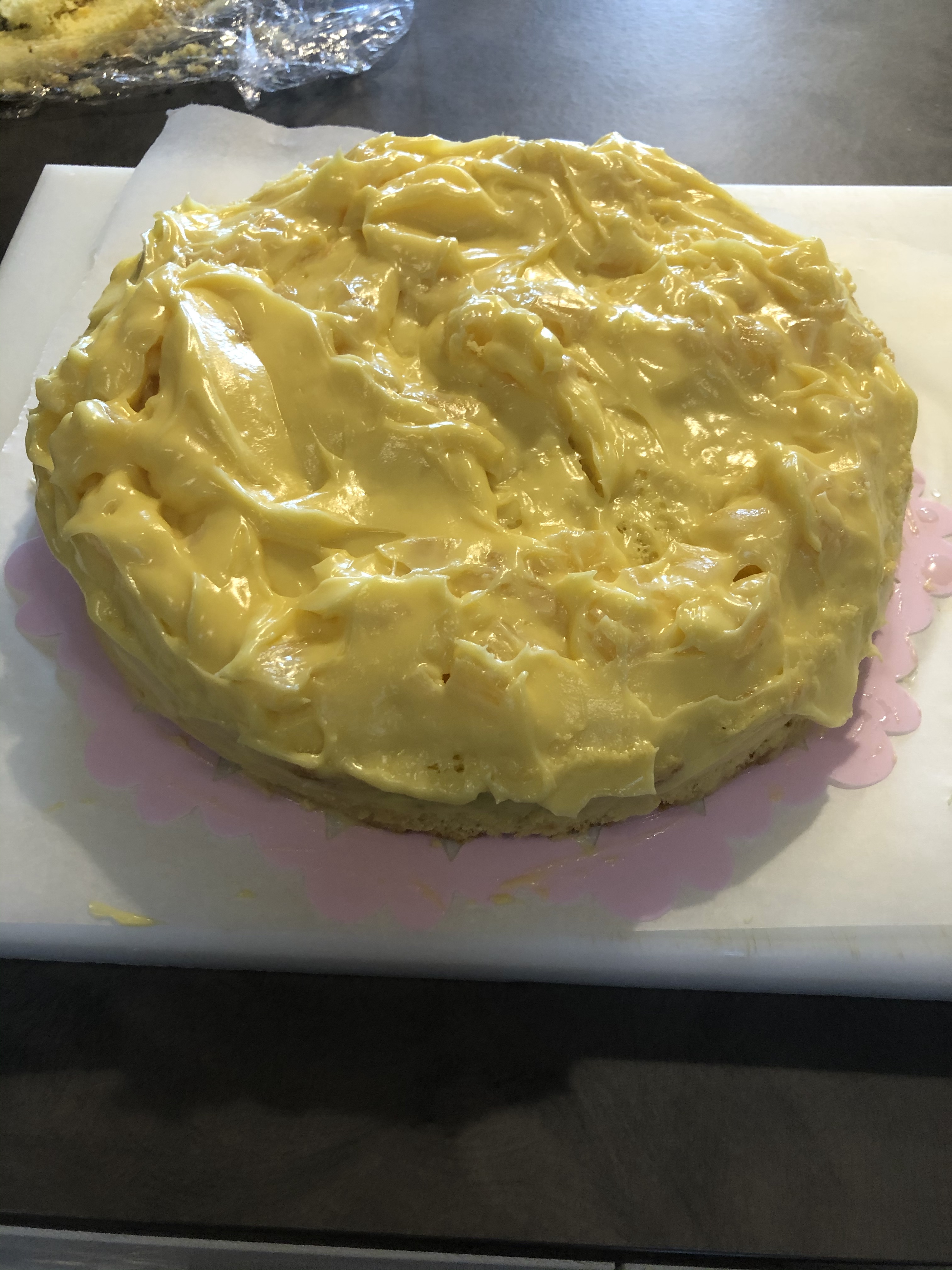 Metto metà della crema sul primo strato che ho leggermente inzuppato con lo sciroppo di ananas o se preferite una bagna al limoncello