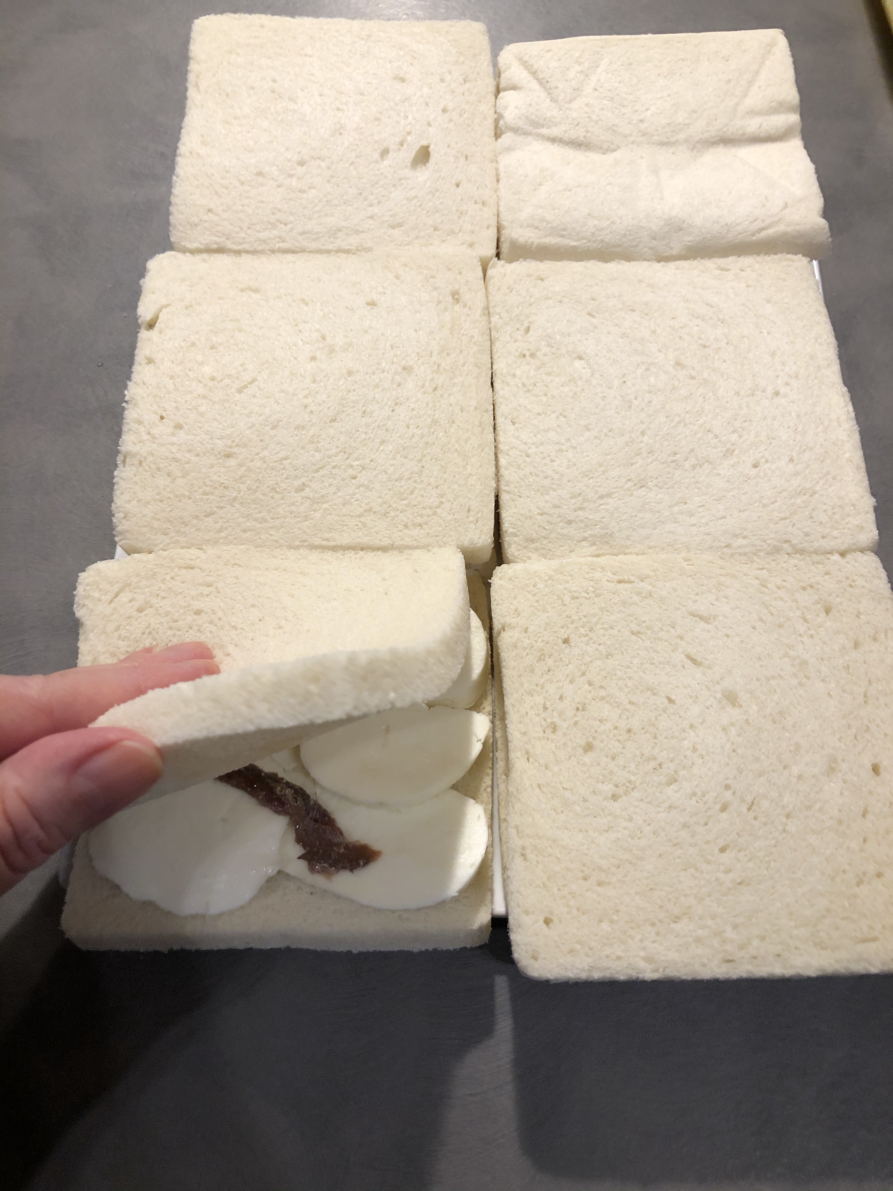 Dispongo le fette di pane sul tagliere, io ho utilizzato quelle per tramezzini senza bordo, ma potete utilizzare anche il pane per toast eliminando la crosta, ricopro con le fette di mozzarella e 2 filetti di acciughe su ogni fetta di pane