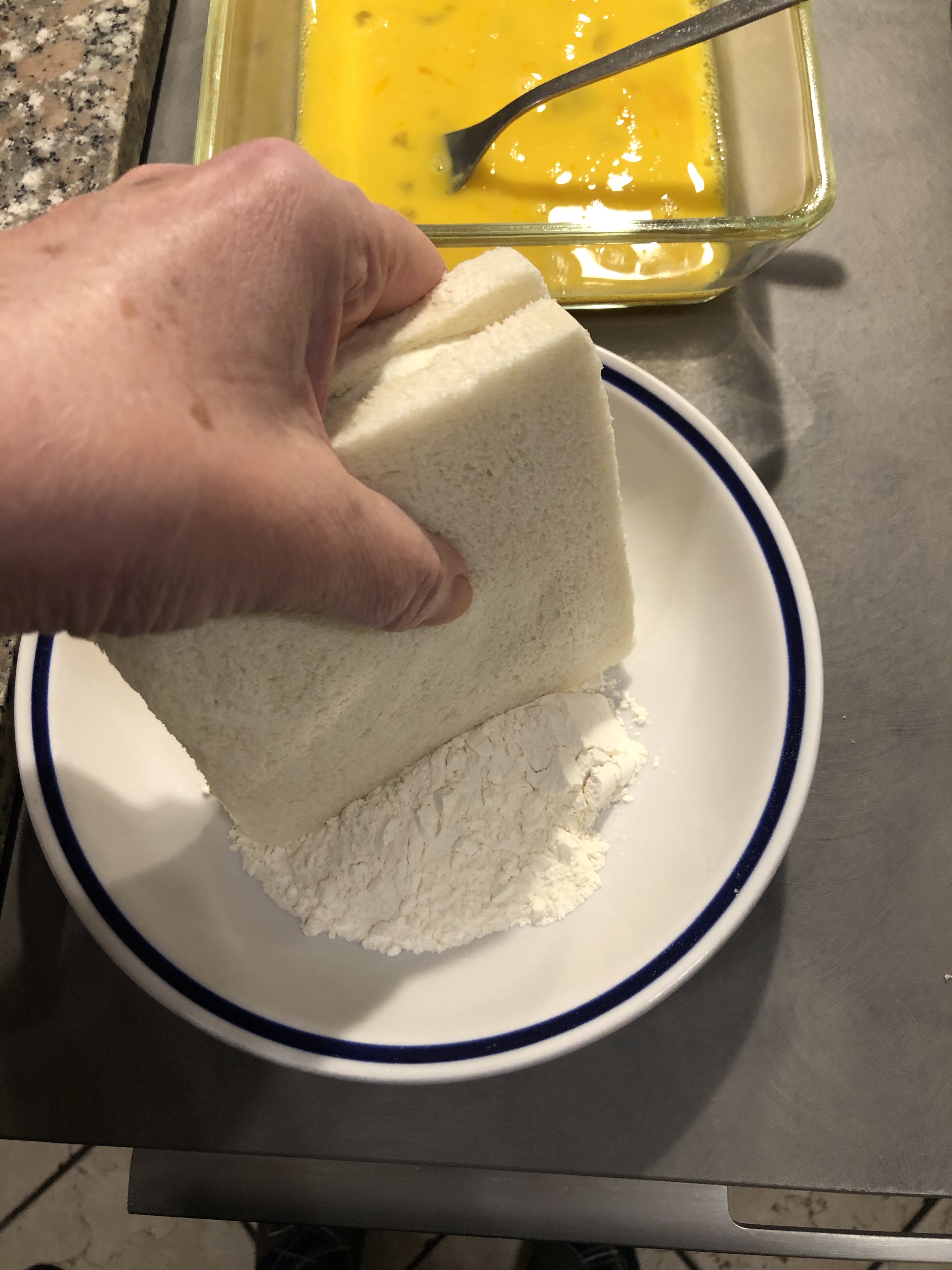 In un piatto metto la farina e tampono tutti i lati del tramezzino