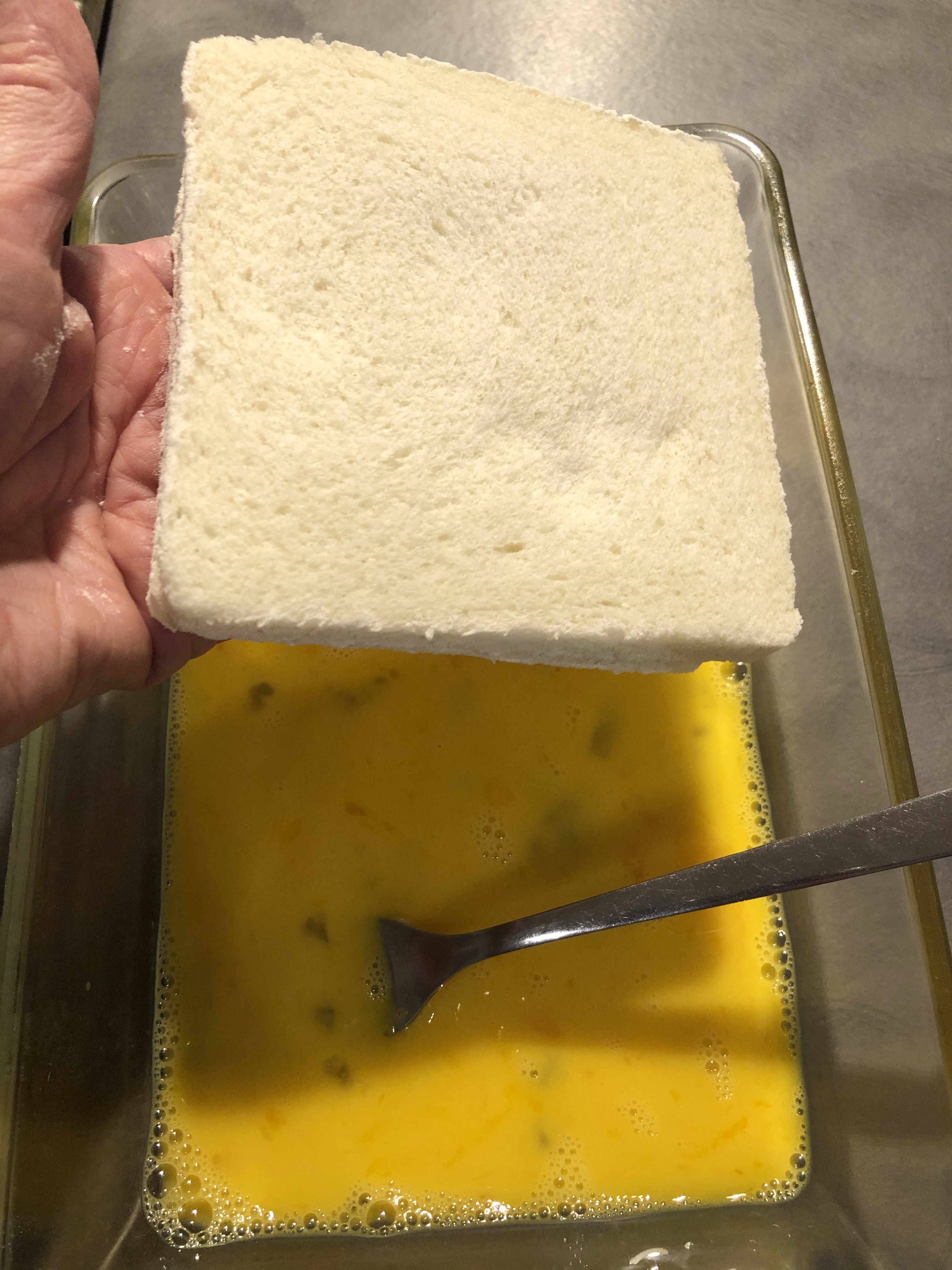 Immergo il tramezzino nell’uovo battuto finché é coperto completamente senza però lasciarle troppo
