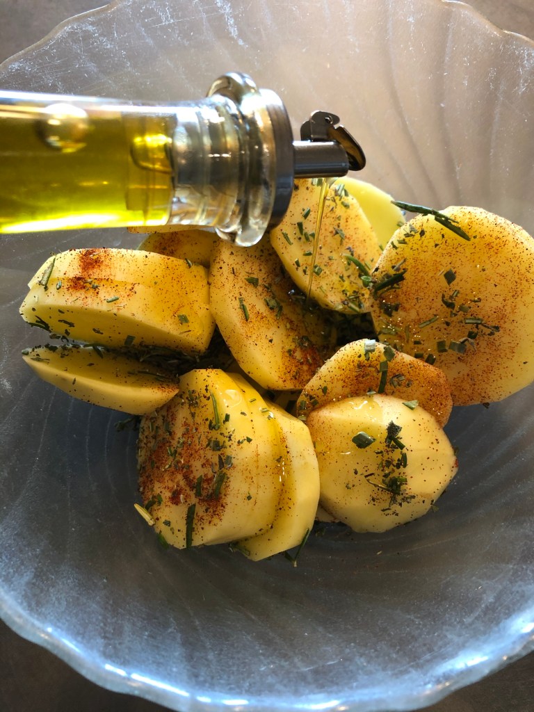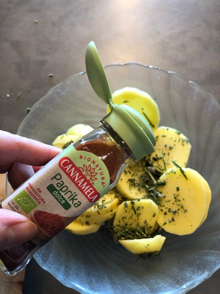 Metto le patate in una grande ciotola, aggiungo le erbe aromatiche, la paprica