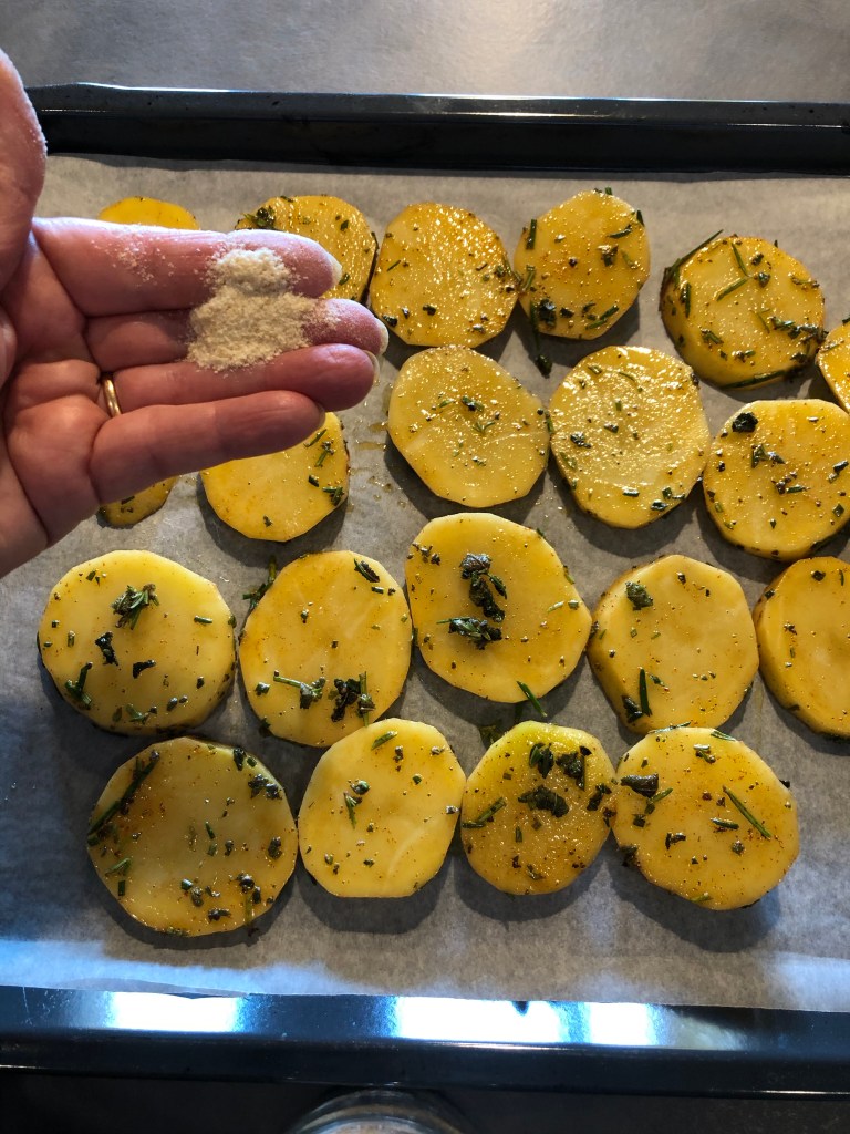 Inforno a 180 gradi per circa 30 minuti, a metà cottura le tolgo dal forno, le salo poi le giro e le salo anche da questo lato