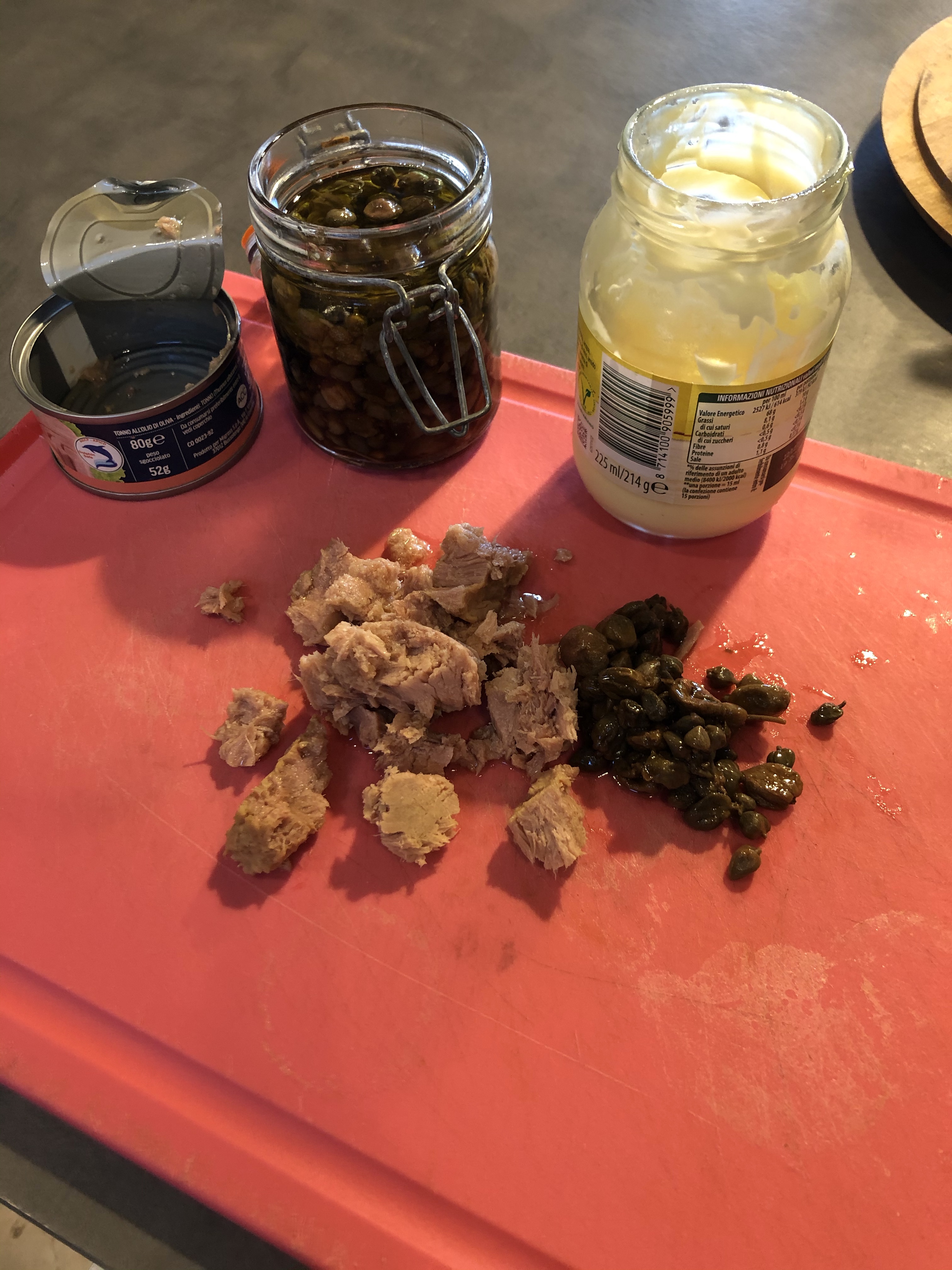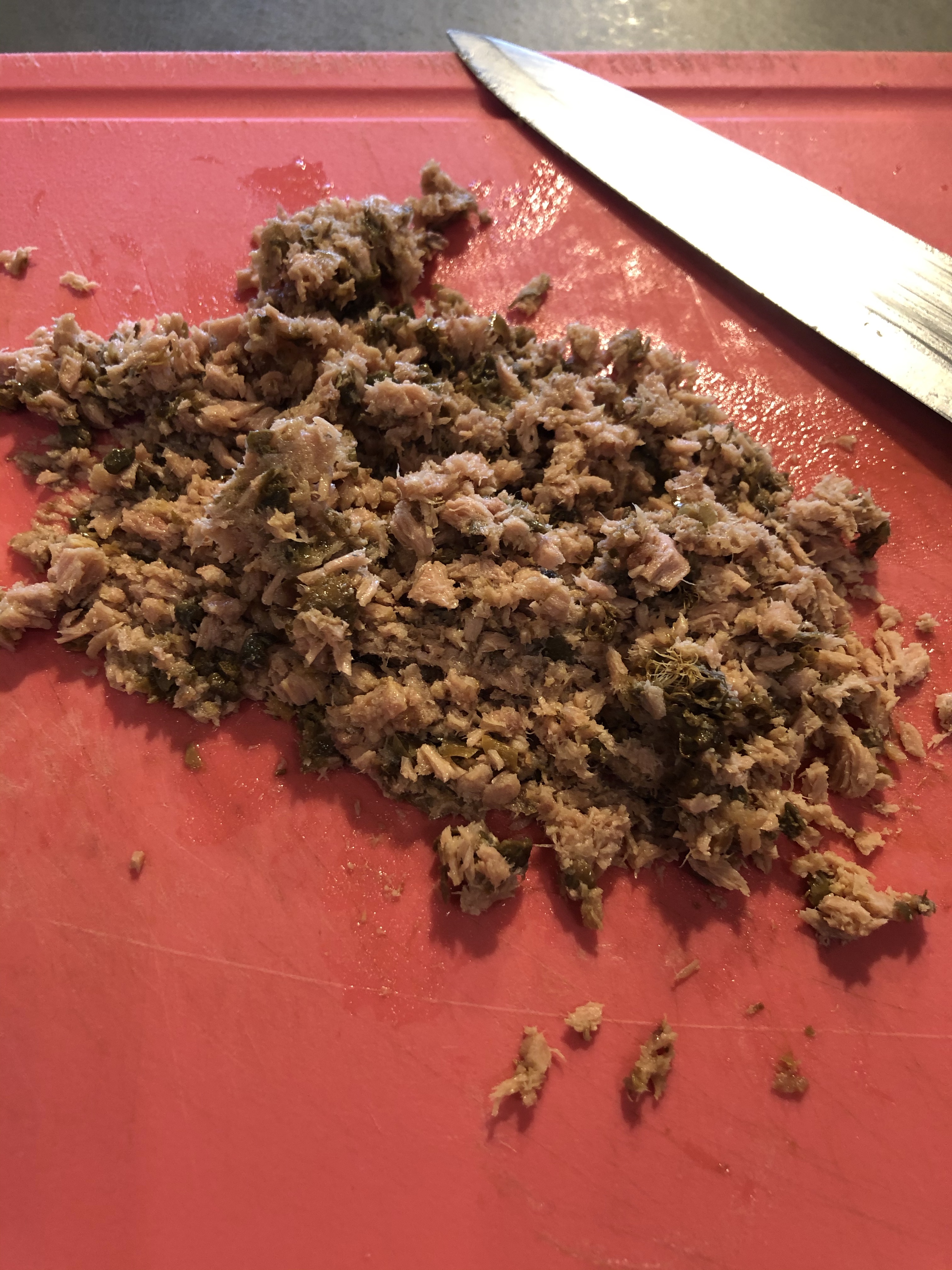 Su un tagliere metto il tonno e i capperi, io ho utilizzato i miei capperi sott’olio