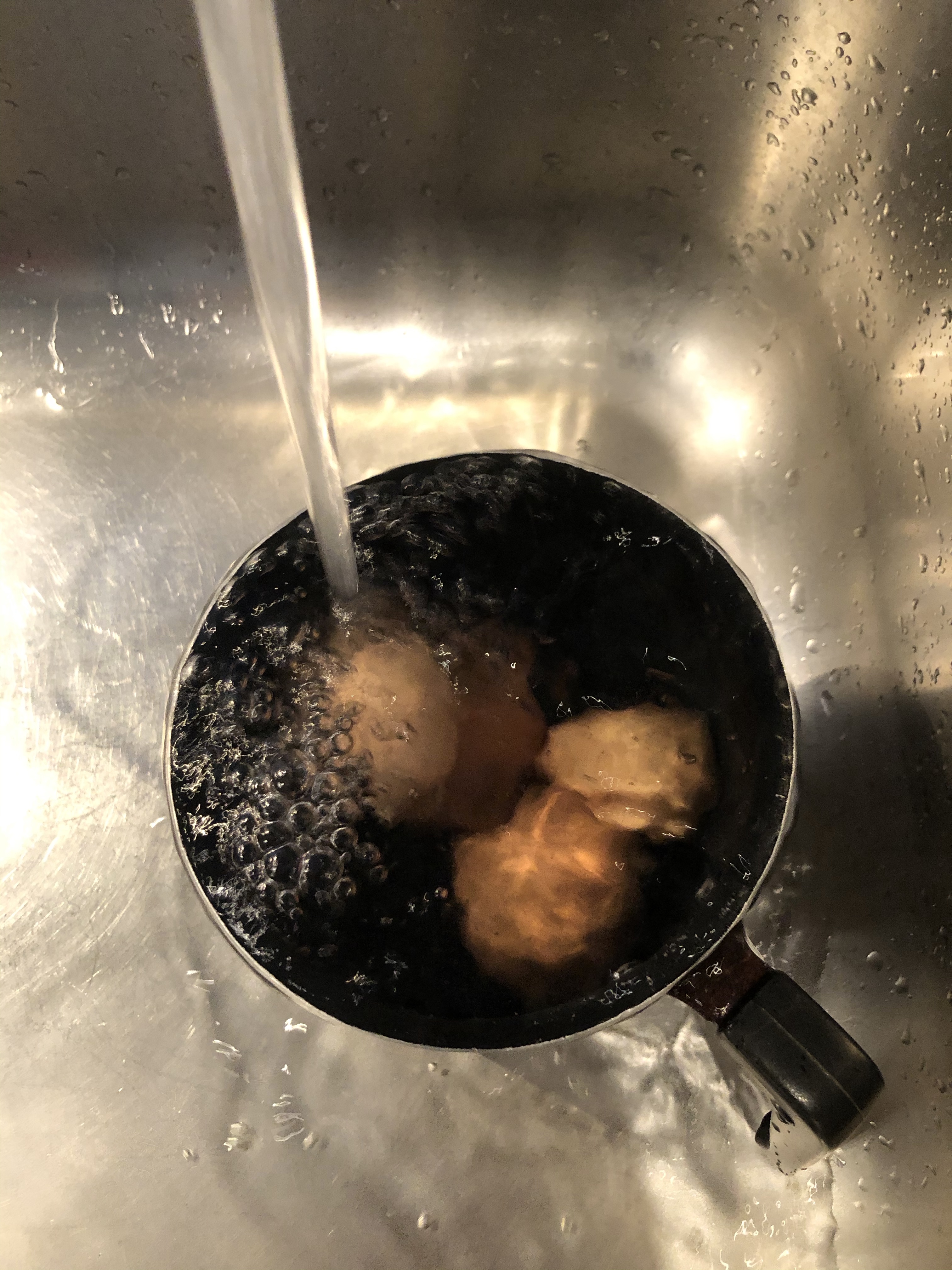 Le uova sono pronte, le raffreddo sotto l’acqua fredda