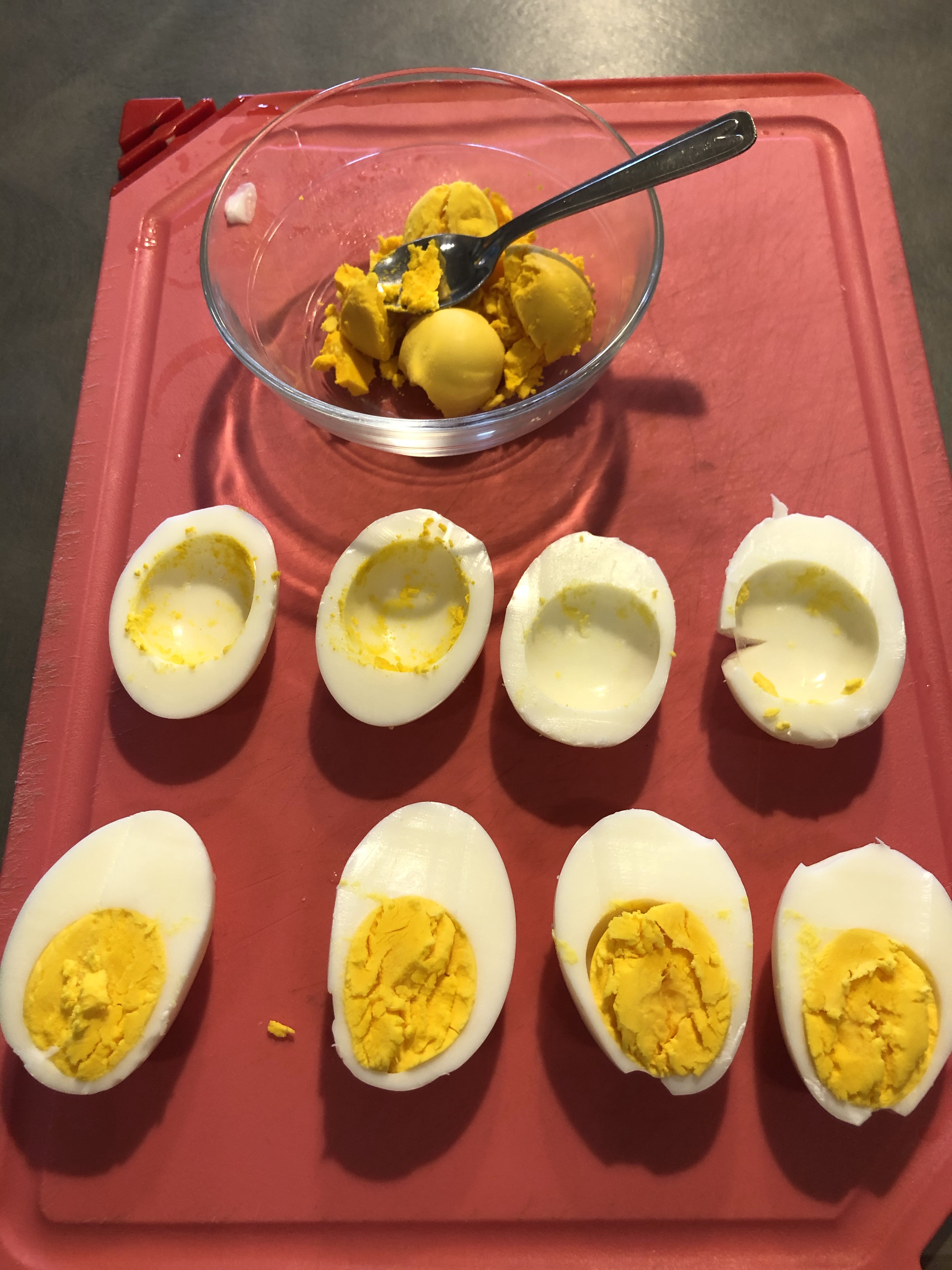 Rassodo le uova, le metto in un pentolino, le copro con acqua fredda e calcolo 10 minuti di cottura dall”inizio del bollore