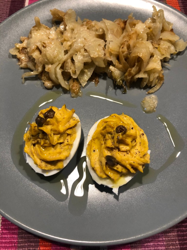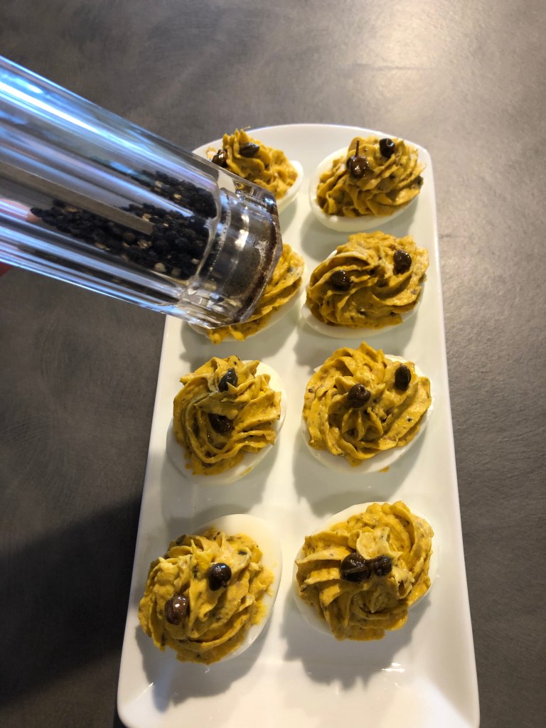 Farcisco l’incavo delle uova, decoro con un paio di capperi e una macinata di pepe e un filo di olio extravergine
