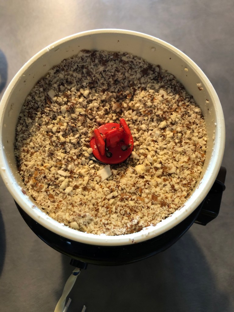 In un padellino faccio tostare le mandorle (120 gr) per pochi minuti poi le trito non troppo finemente con un mixer