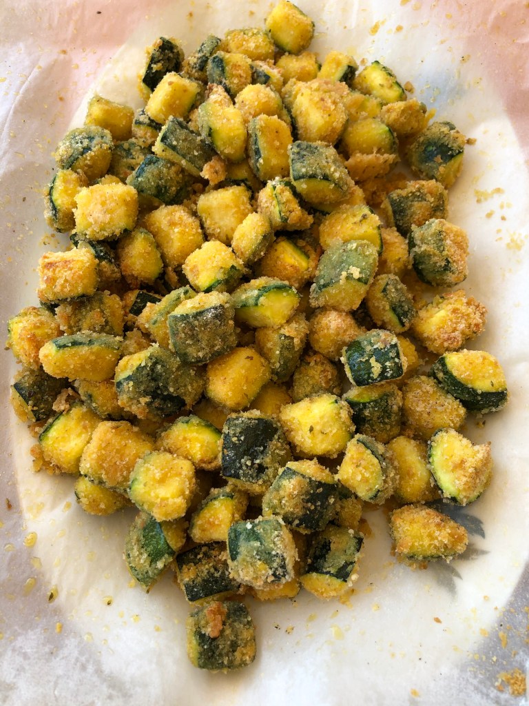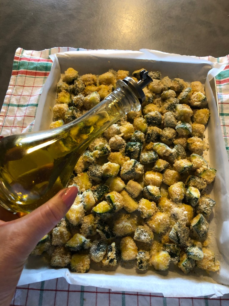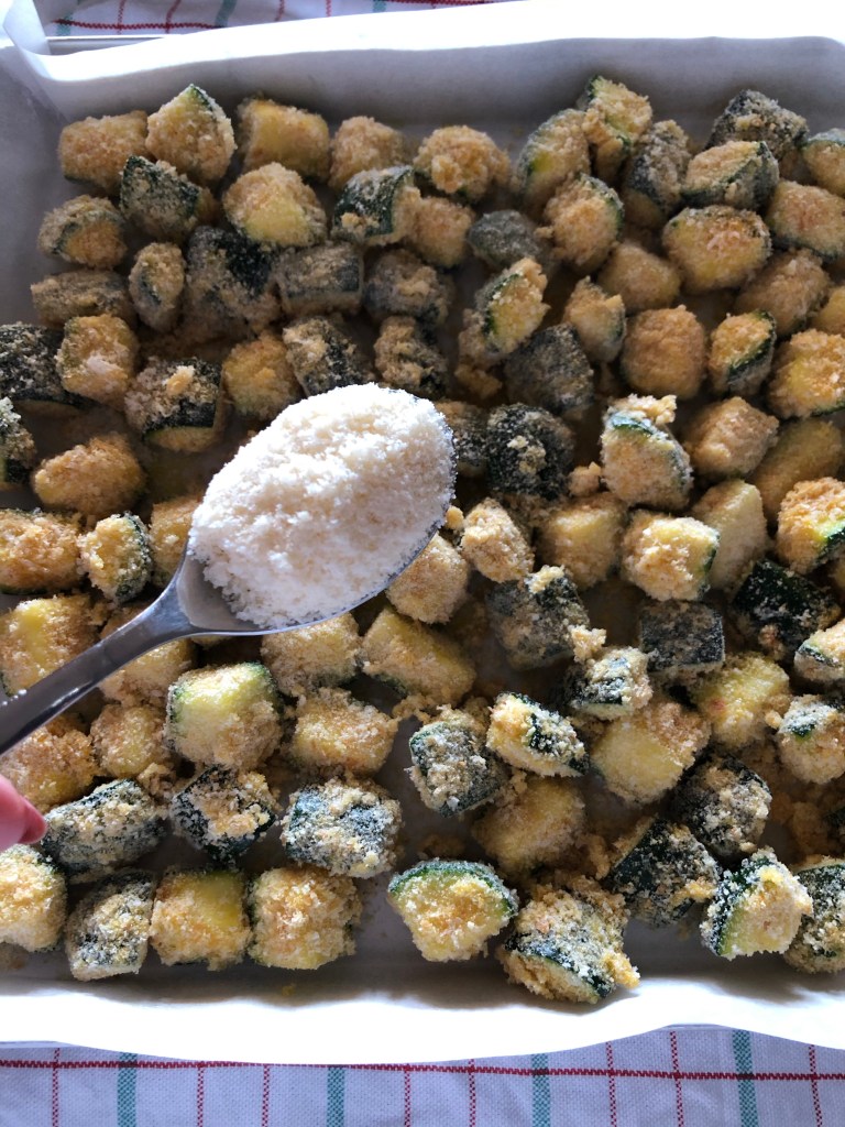 Copro una teglia con carta forno, verso sul fondo dell’olio e dispongo le zucchine in un solo strato e cospargo con qualche cucchiaio di formaggio grattugiato