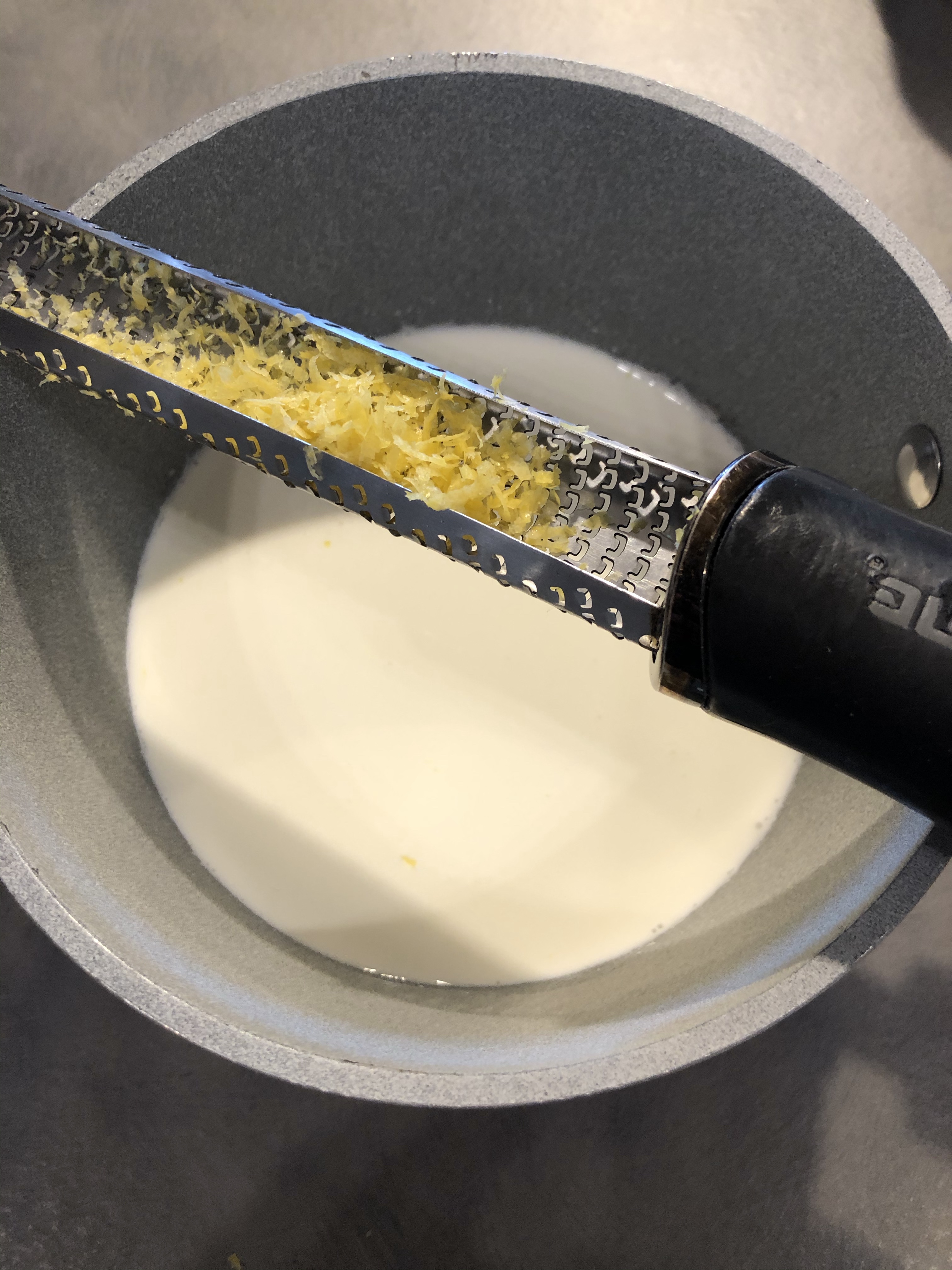 Metto la gelatina ad ammollare in acqua fredda per 10 minuti, verso la panna in un pentolino con la buccia grattugiata di limone o lime