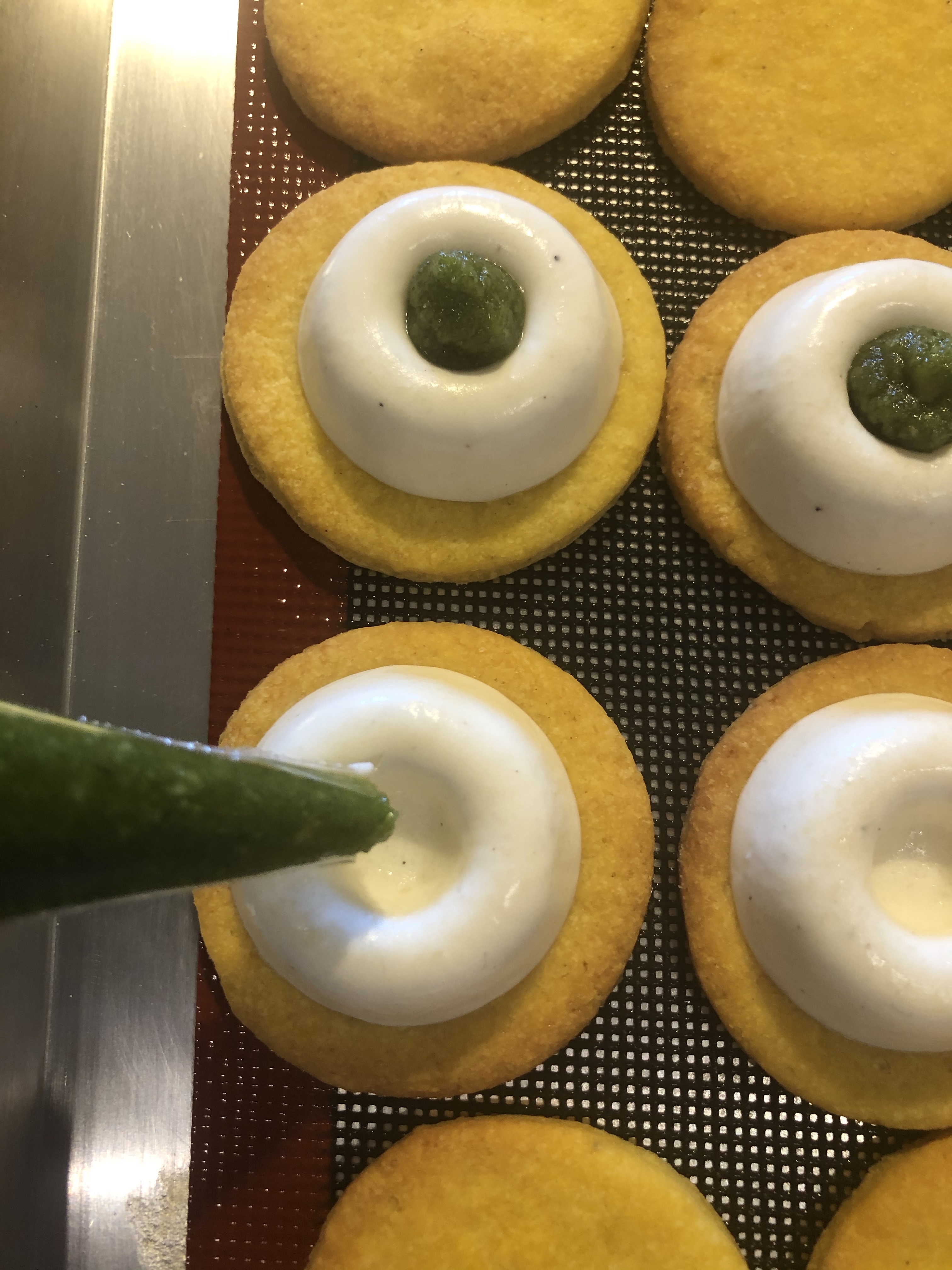 Per preparare il finger food appoggio la panna cotta ancora congelata su una base di frolla salata e nel buchino aggiungo uno spuntone con del pesto al basilico che ho inserito in un sac a poche, decoro con una piccola fogliolina di basilico