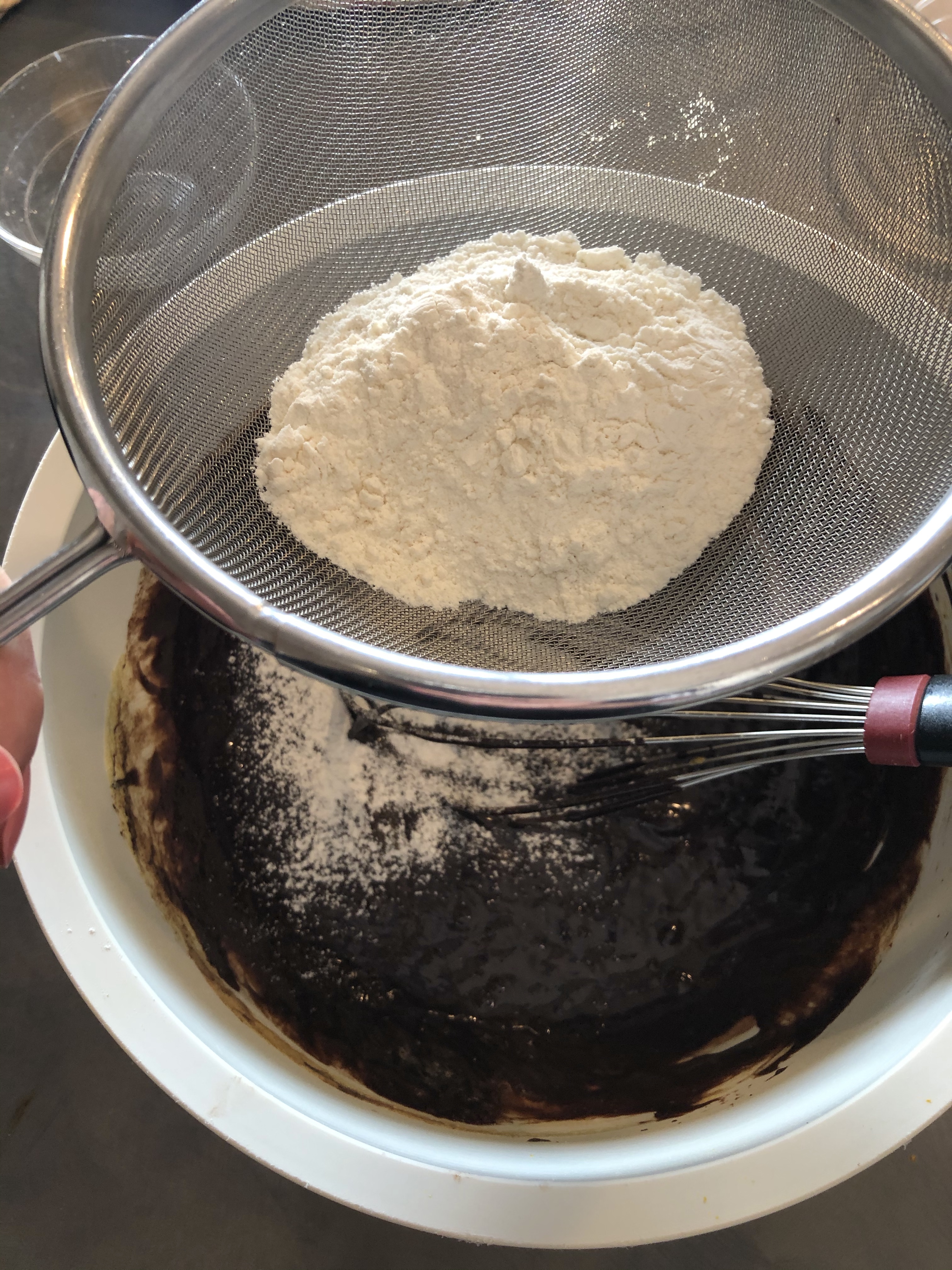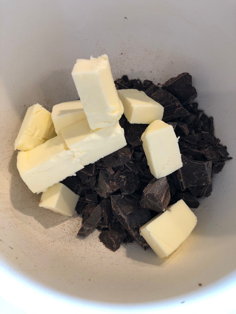 Taglio il cioccolato in piccoli pezzi e li metto in una ciotola con il burro e sciolgo a microonde oppure a bagnomaria