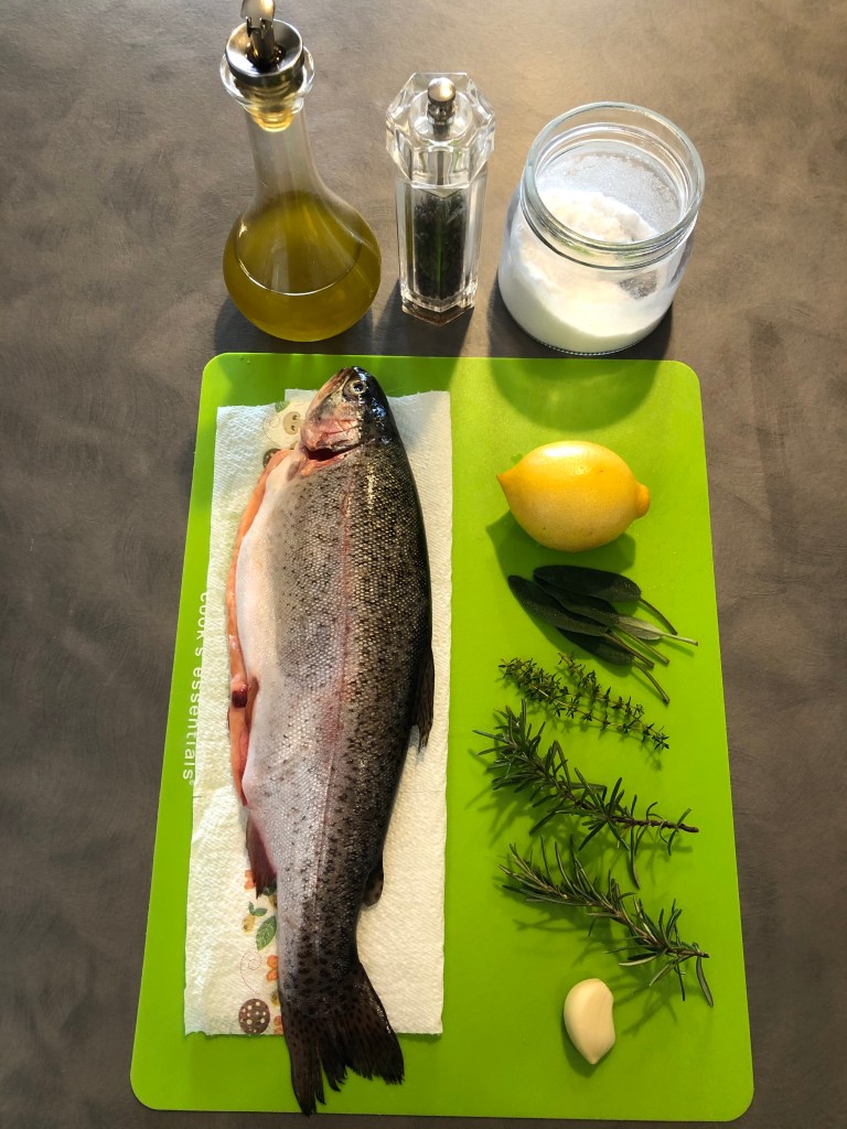 Dopo aver eviscerato la trota, la lavo accuratamente, elimino le squame e la asciugo, io ho utilizzato la carta fata che é trasparente, ma potete utilizzare la classica carta forno, appoggio sul foglio delle fettine di limone e alcuni rametti di erbe aromatiche