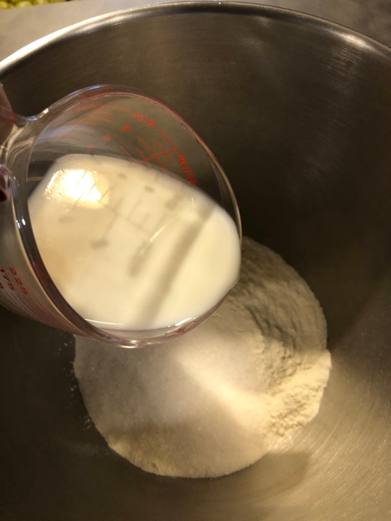 Nella ciotola dell’ impastatrice, ma potete farlo a mano, verso la farina e lo zucchero