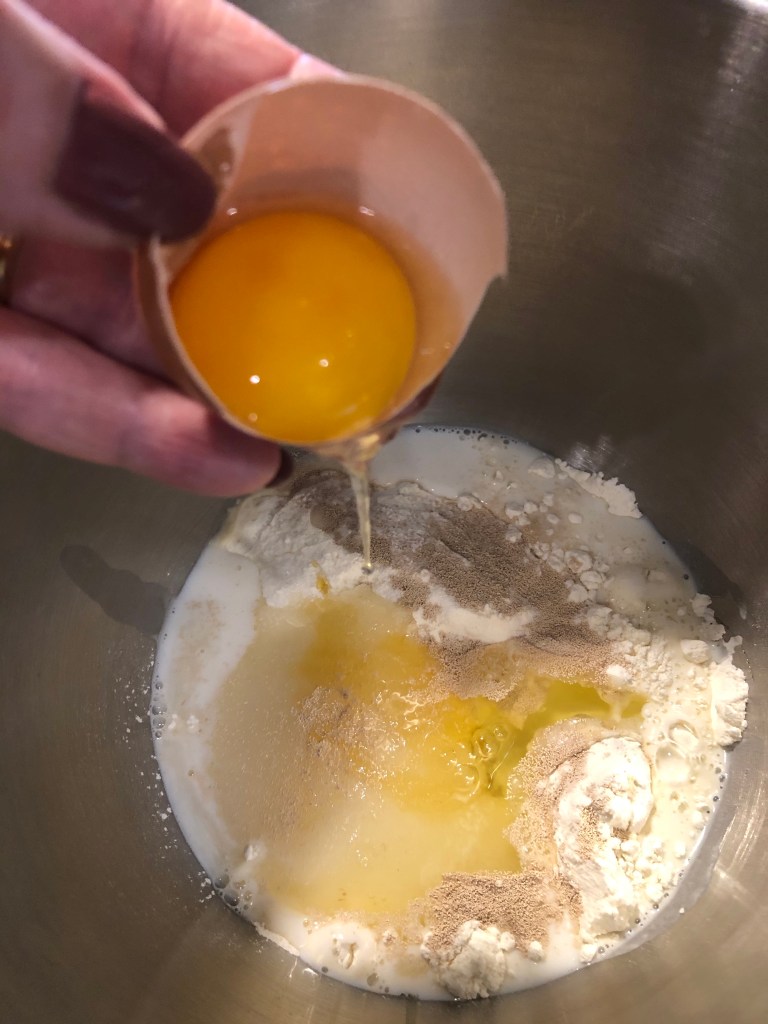 Tolgo dall’impastatrice e verso l’impasto sul piano di lavoro, impasto con le mani un attimo e formo una palla che metto in una ciotola coperta con pellicola e la lascio lievitare in forno spento con la luce accesa per 1 ora, si gonfierà ma non moltissimo