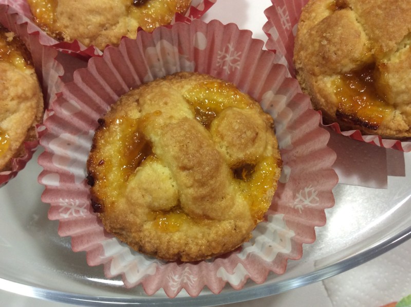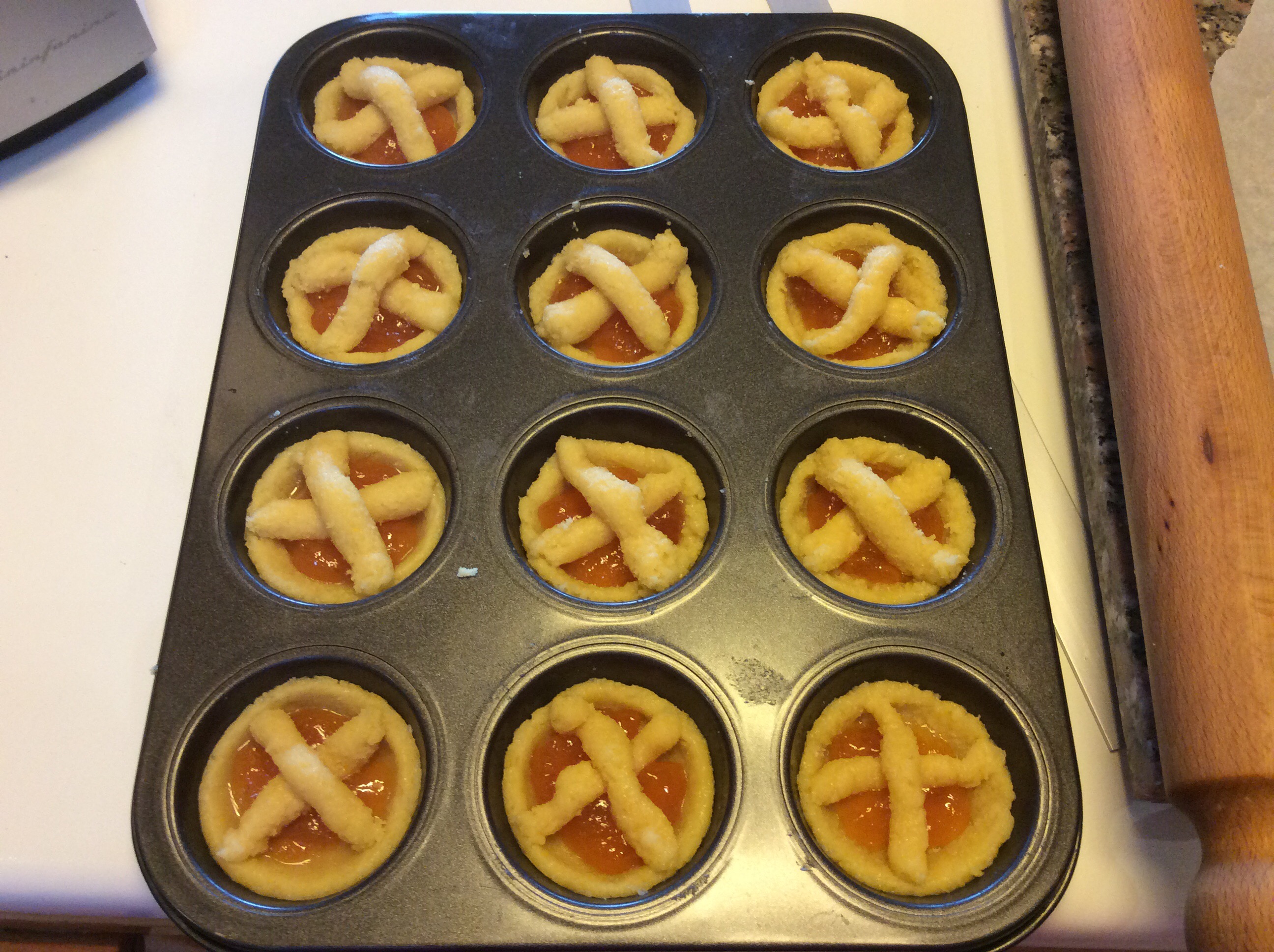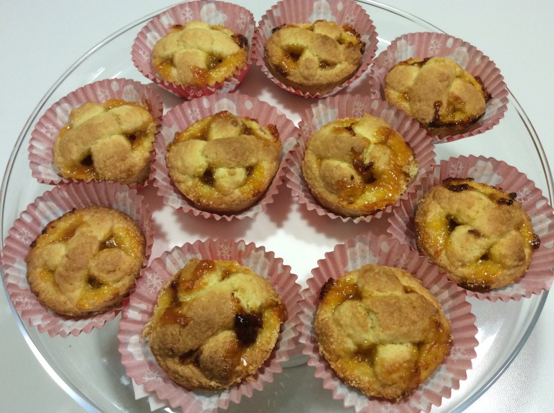 Li sistemo in uno stampo da muffin, aggiungo un cucchiaino di marmellata e con la pasta formo dei rotolini e li dispongo a croce