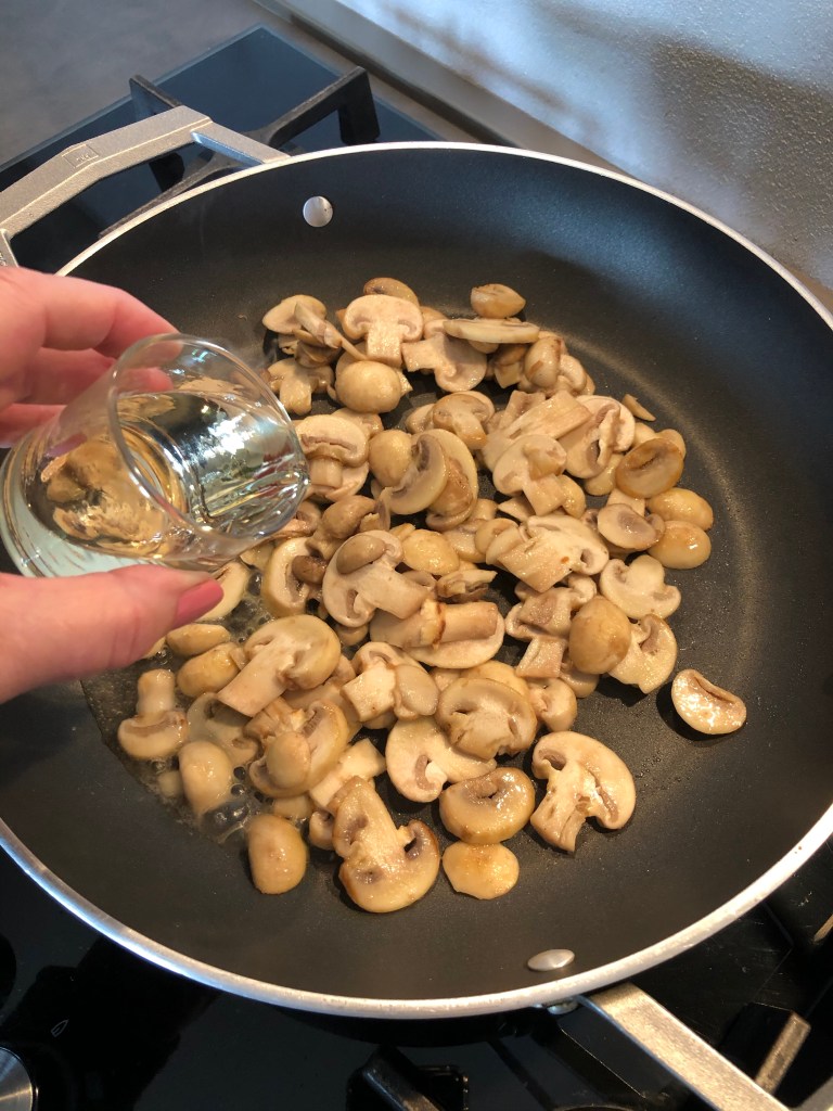 Verso i funghi e li cuocio a fiamma alta, sfumo con mezzo bicchiere di vino bianco e lascio evaporare