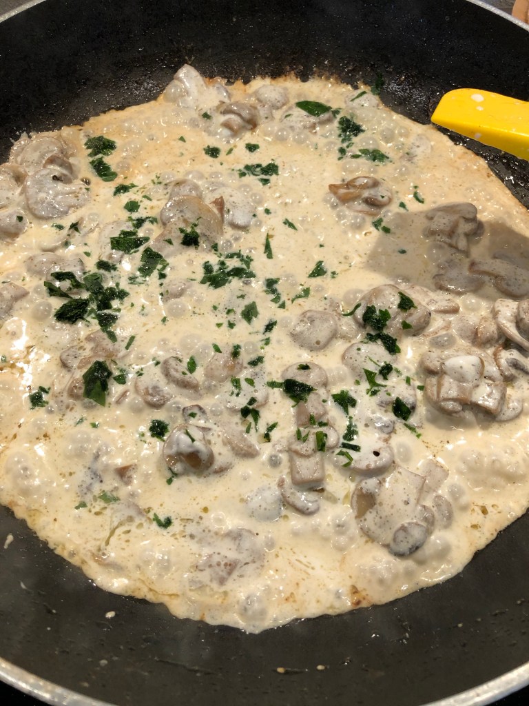 Li tolgo un attimo dalla padella e li tengo in caldo e nella stessa padella aggiungo la panna e i funghi cotti , amalgamo bene e lascio restringere la salsa per qualche minuto, aggiungo il prezzemolo tritato
