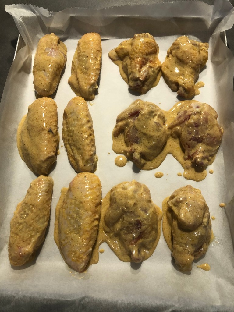 Metto in frigorifero per un paio di ore, trascorso il tempo tolgo le alette dalla marinata e le appoggio su una teglia ricoperta di carta forno