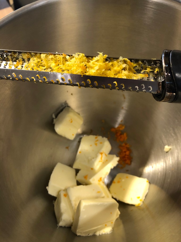 Nella ciotola dell’impastatrice metto il burro che deve essere molto morbido ma non sciolto, aggiungo la buccia grattugiata dell”arancia e del limone, se non avete l”impastatrice va bene una ciotola e le fruste elettriche