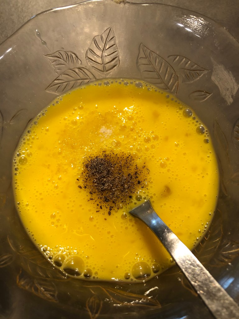 In una ciotola rompo le 2 uova e il tuorlo, lo batto con una forchetta e sciolgo il pizzico di sale