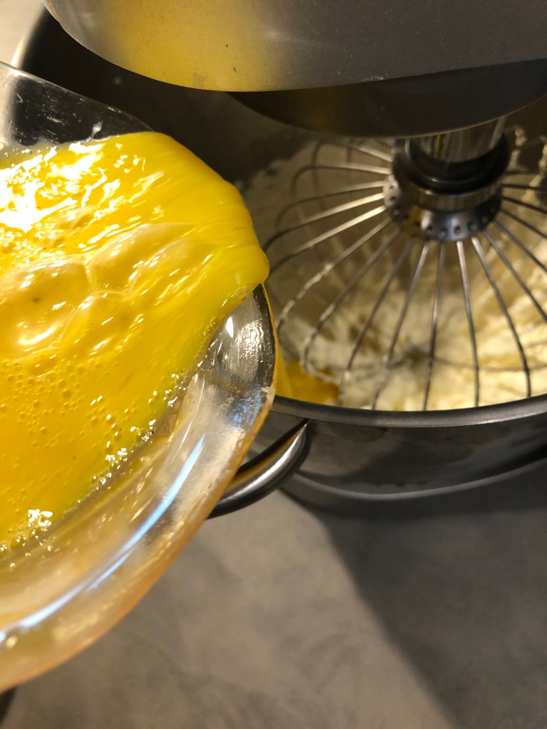 Inizio a montare e quando inizia a formare una crema aggiungo lo zucchero a velo