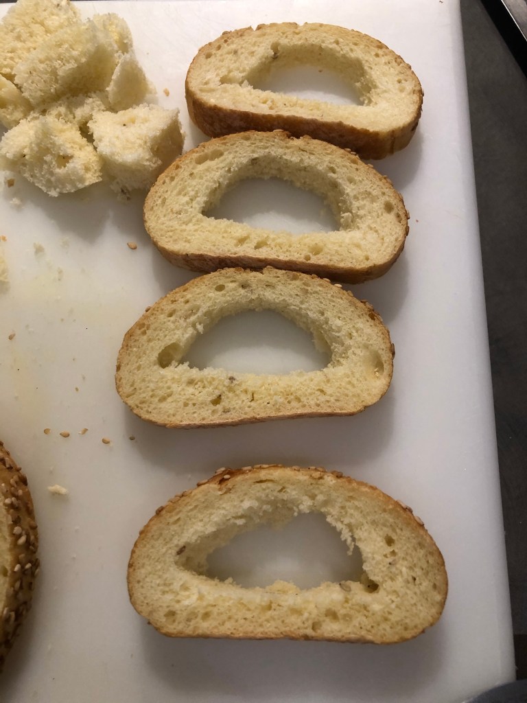 Io ho utilizzato un filone di pane con semi di sesamo, taglio delle fettine di 1 cm circa, potete utilizzare anche del pane raffermo