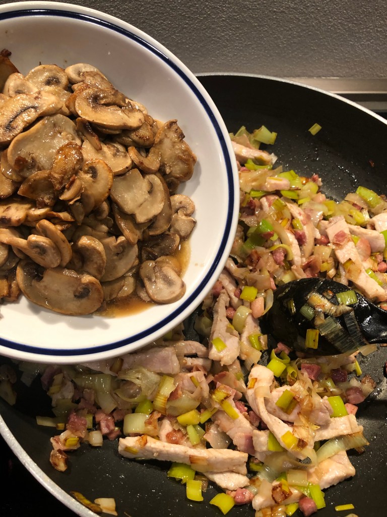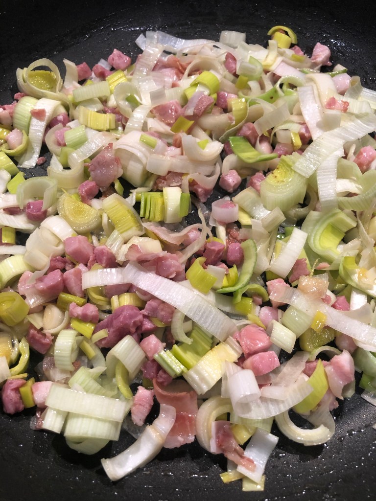 In una padella verso un goccio di olio, lo scaldo aggiungo i porri e la pancetta e cuocio finché il porro é morbido