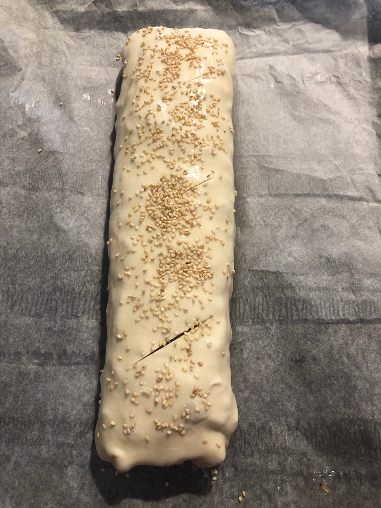 Inumidisco i bordi e arrotolo formando lo strudel e sigillo bene i lati, tenendo la chiusura sul fondo, spennello con poco latte e cospargo di semi di sesamo, pratico alcuni tagli in superficie e lo trasferisco sulla placca del forno