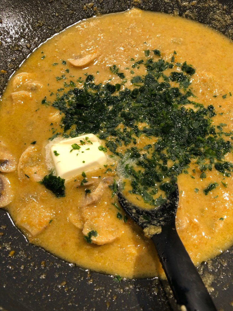 Aggiungo il burro e il prezzemolo tritato, il sugo deve essere denso e ben amalgamato