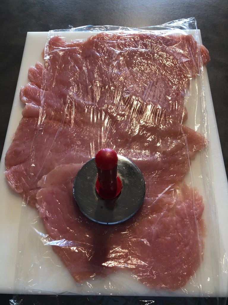 Apro a libro la fesa di tacchino, la appiattisco cercando di dare una forma rettangolare, per non stracciare la carne la copro con un foglio di pellicola e batto con il batticarne, rendendola piuttosto sottile circa 1 cm
