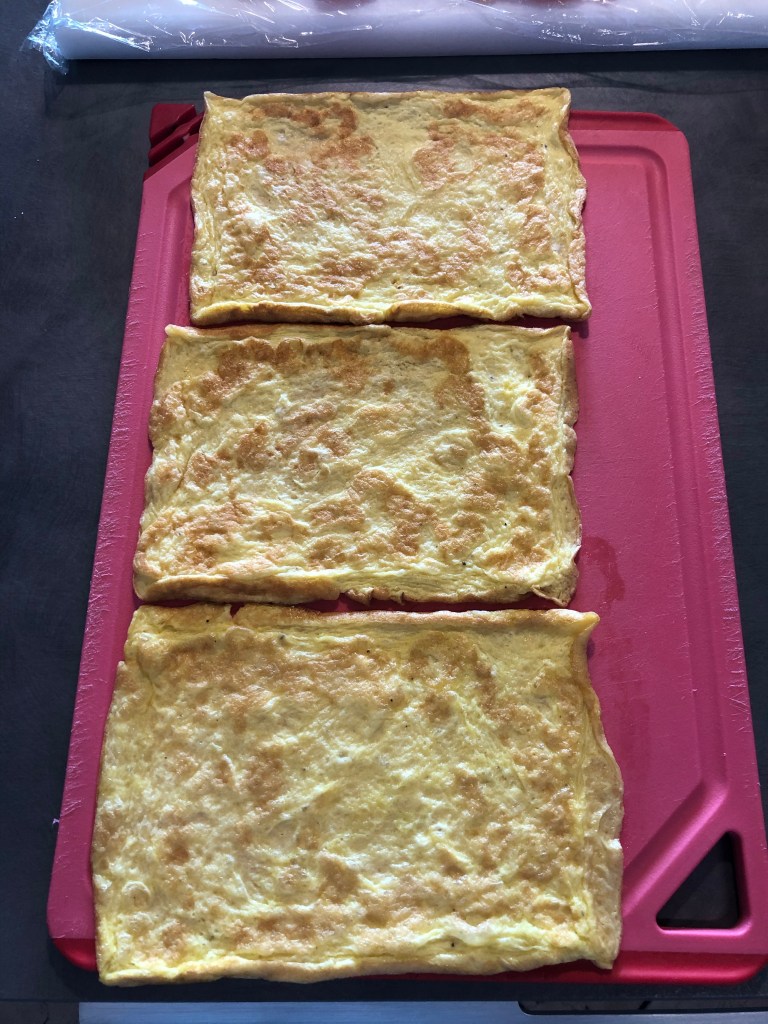 Divido in 3 parti e preparo le frittatine sottili, meglio utilizzare un pentolino antiaderente il mio é rettangolare unto con poco olio