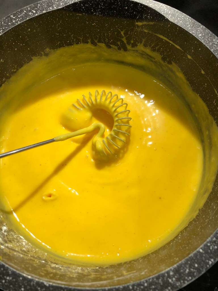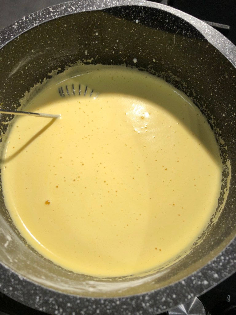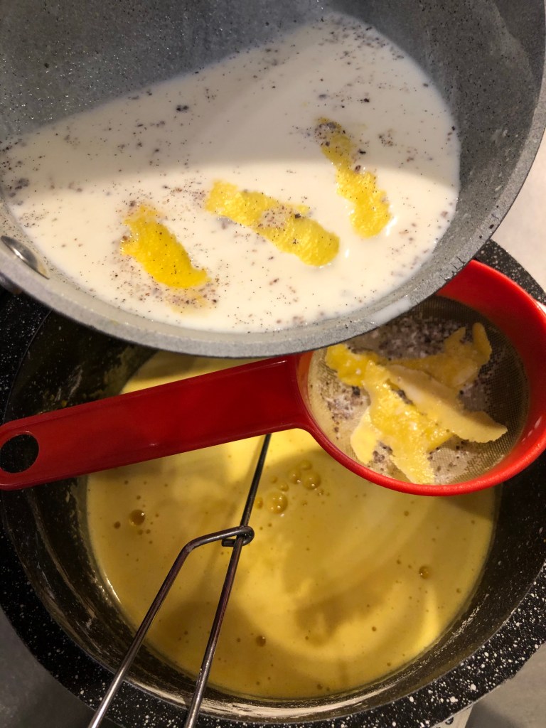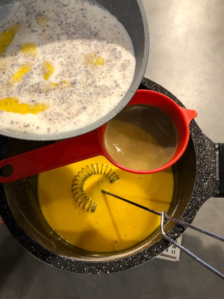 Quando il latte sfiora il bollore lo verso in 3 volte sulle uova dopo averlo filtrato sempre mescolando
