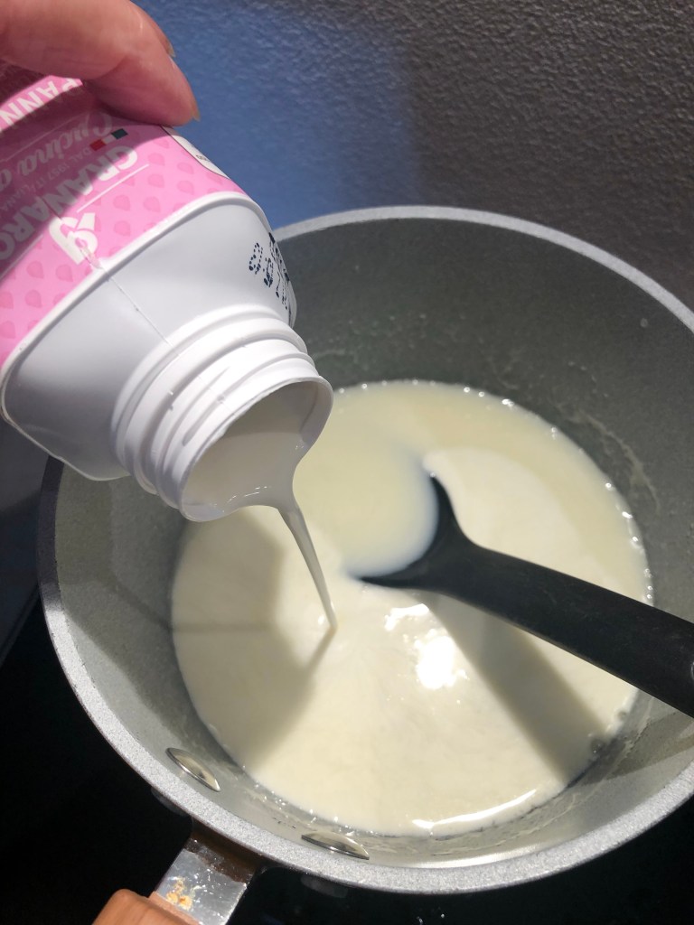 In un pentolino scaldo 150 gr di panna con lo zucchero