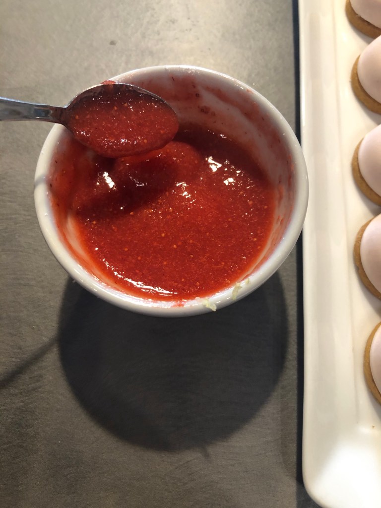Al centro potete mettere del topping o della marmellata di fragole, io ho utilizzato della purea di fragole che ho dolcificato con poco zucchero e fatta addensare