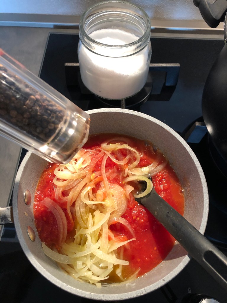 Dopo 10 minuti aggiungo la salsa di pomodoro, regolo di sale e pepe, copro e lascio cuocere per circa 15 minuti