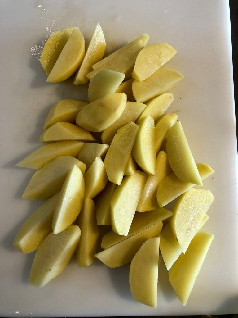 Sbuccio le patate, le lavo e le taglio a spicchi piuttosto grandi