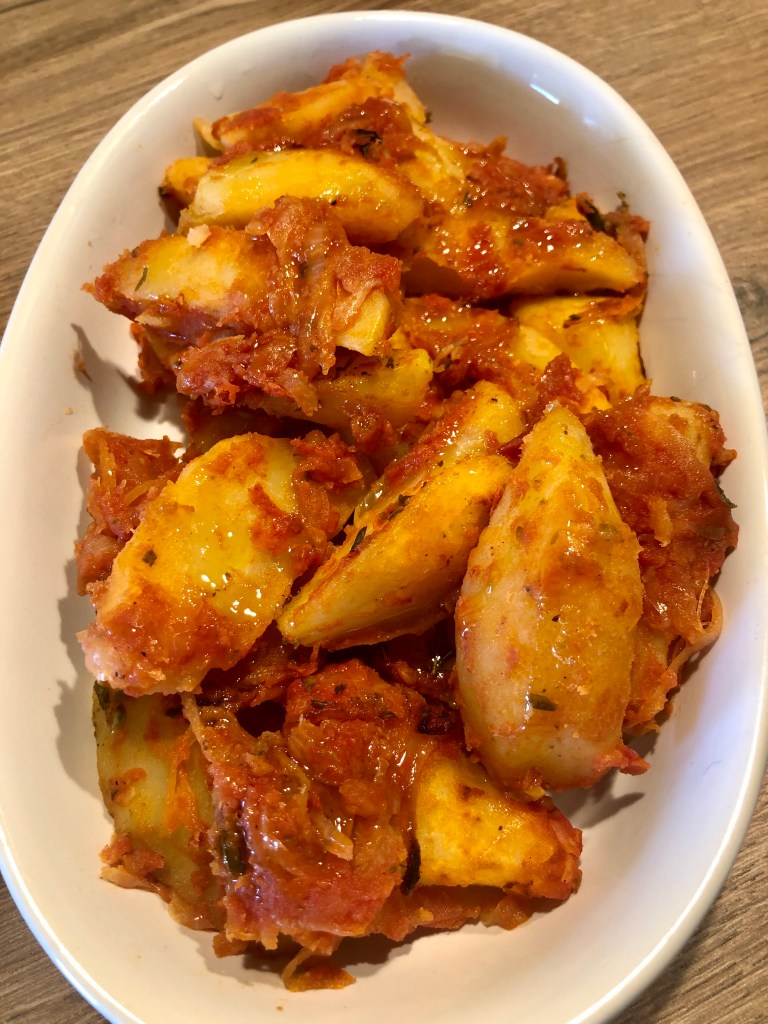 Inforno a 200 gradi per circa 40 minuti, a metà cottura le giro, le lasci riposare una decina di minuti prima di servirle