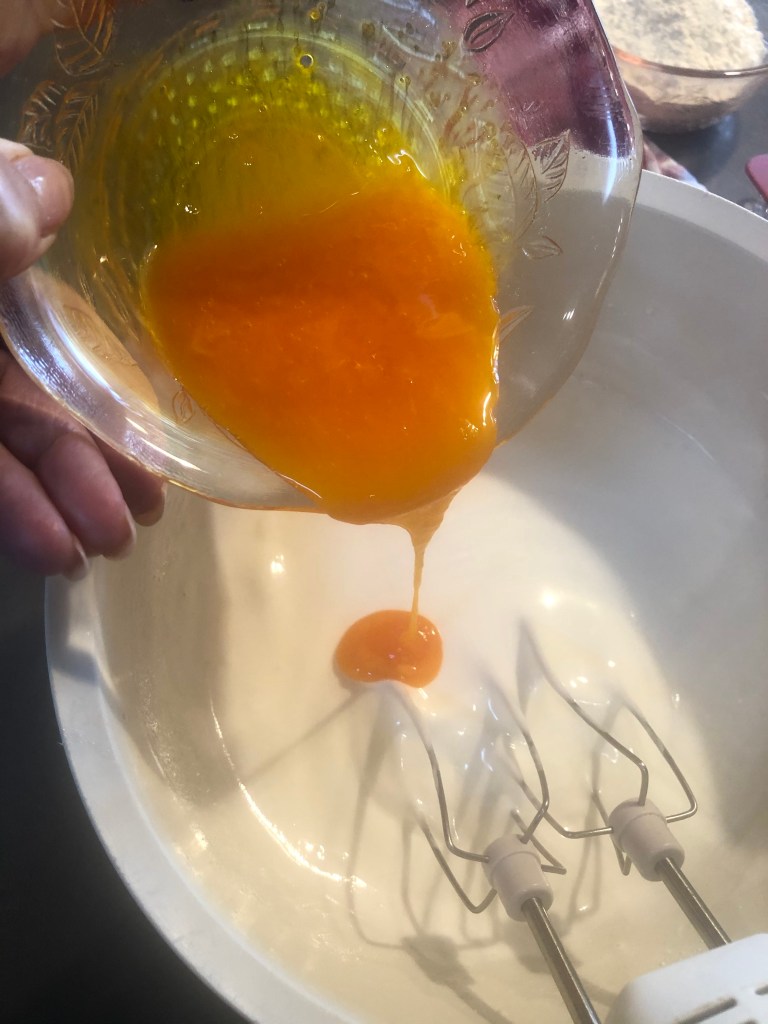 Aggiungo alla crema ottenuta la farina setacciata in 3 volte e mescolo con una spatola delicatamente dal basso verso l’alto per non smontare il composto