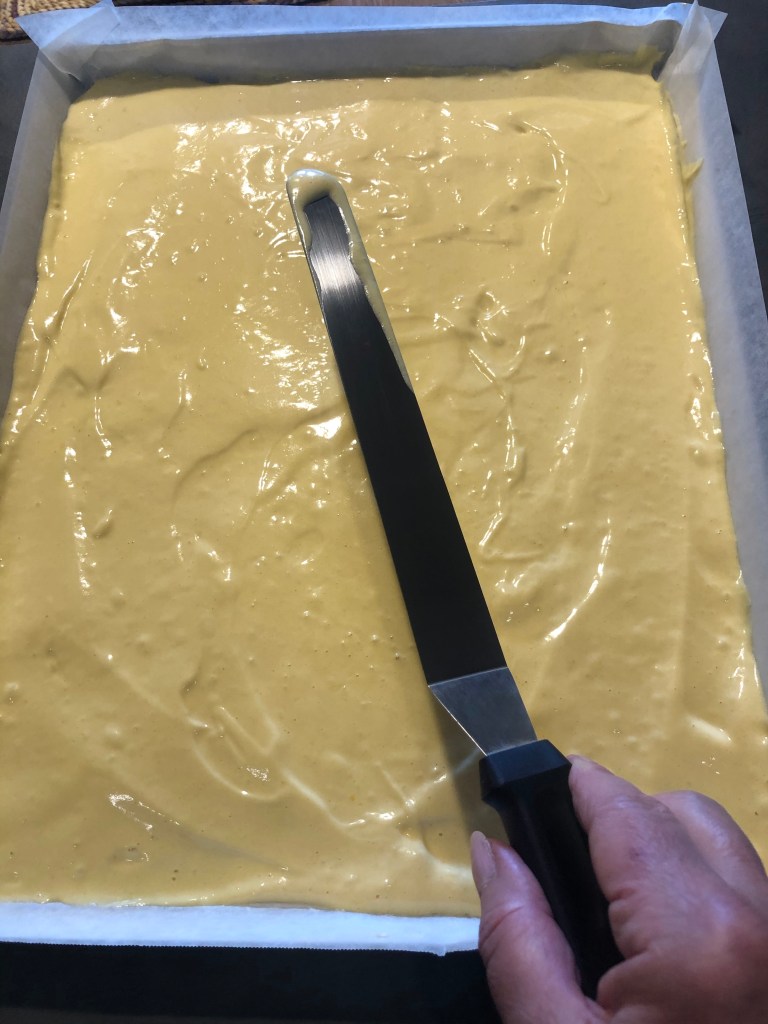 Stendo il composto ottenuto nella teglia livellando con una spatola, la mia teglia é 32x 42, potete utilizzare anche la teglia del forno