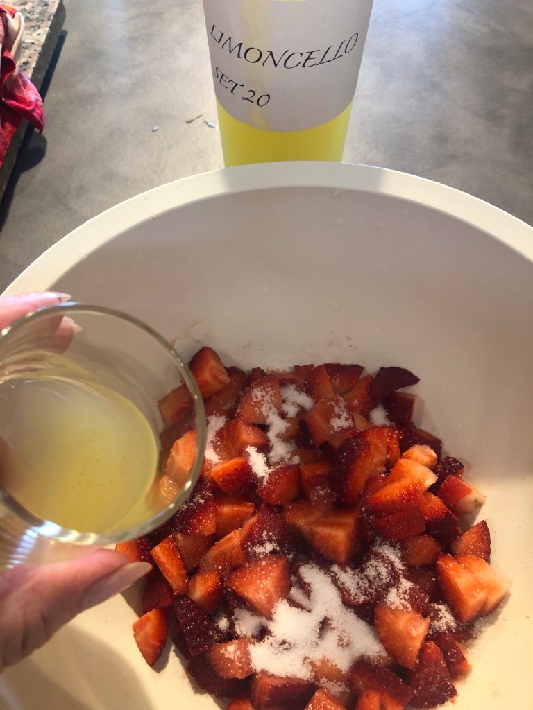 Lavo le fragole e le taglio a pezzettini, le metto in una ciotola con due cucchiai di zucchero e mezzo bicchierino di limoncello, é facoltativo, se avete bambini evitatelo, mescolo e le tengo da parte