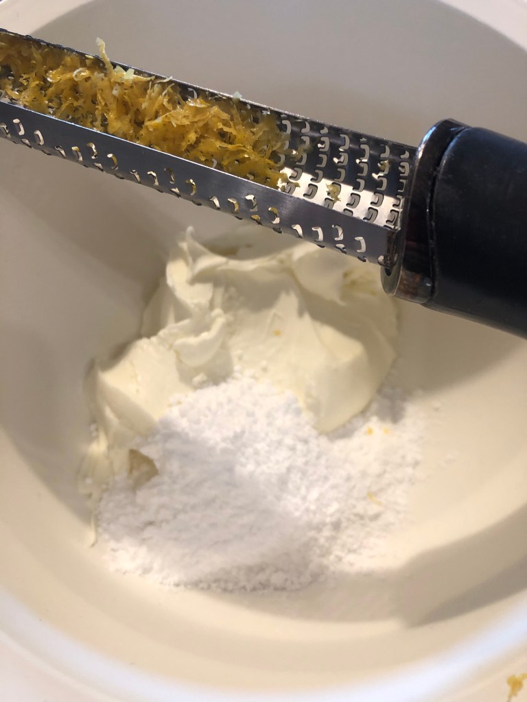 Preparo la crema al mascarpone, con le fruste lavoro il mascarpone con lo zucchero e la buccia del limone grattugiata