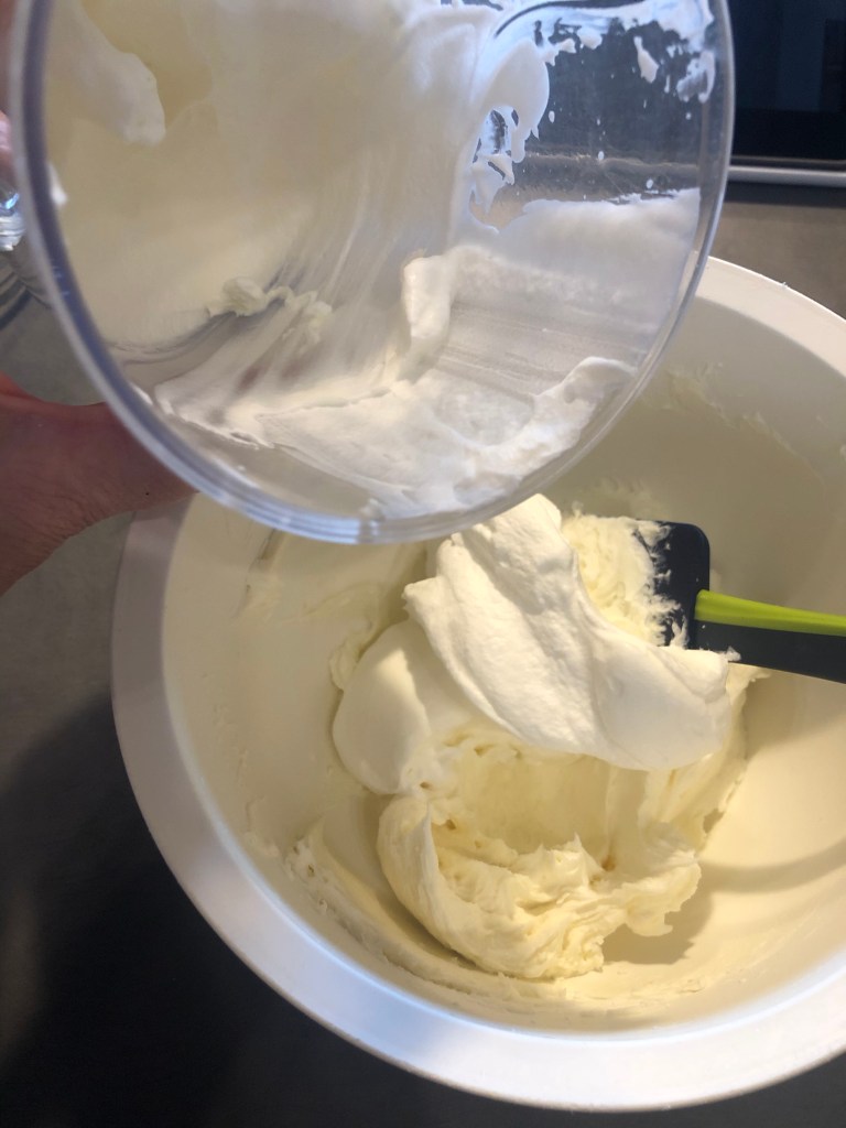 A parte monto la panna e la aggiungo delicatamente al mascarpone mescolando dal basso verso l’alto, se volete potete montare tutto insieme, mascarpone, panna e zucchero