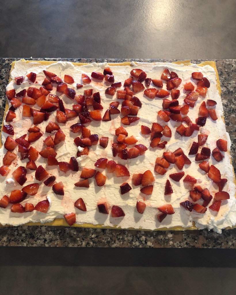 La crema é pronta, tolgo la carta forno dalla pasta biscotto, rifilo i bordi e spalmo tutta la superficie con la crema, aggiungo le fragole