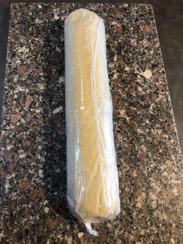 Avvolgo il rotolo con carta forno tenendo la giuntura verso il basso e poi con pellicola e metto in frigorifero per alcune ore prima di servirlo