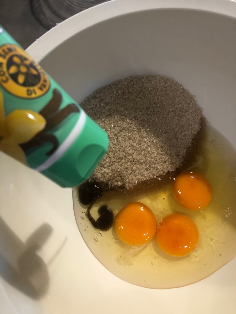In un’altra ciotola verso lo zucchero, le uova, l’estratto di vaniglia