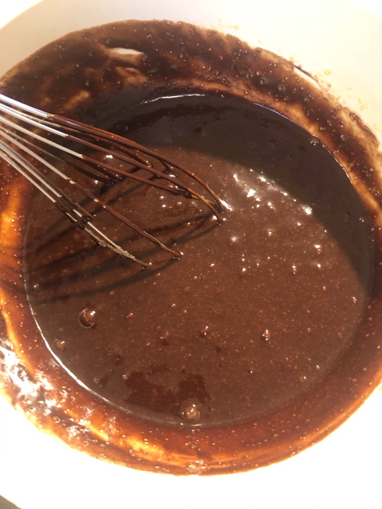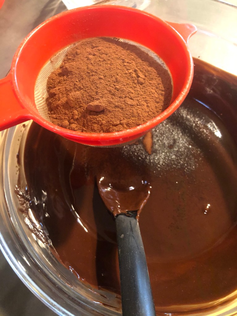 Quando il cioccolato é sciolto perfettamente lo tolgo dal gas aspetto un attimo poi aggiungo il cacao setacciato mescolando bene