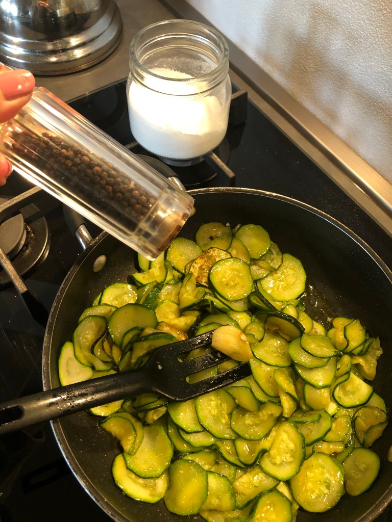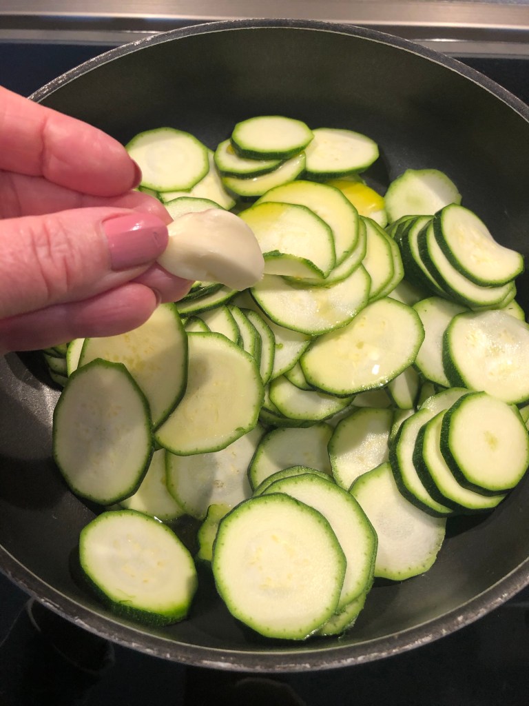 Lavo e spunto le zucchine, le taglio con una mandolina e le metto in una padella con olio e uno spicchio di aglio