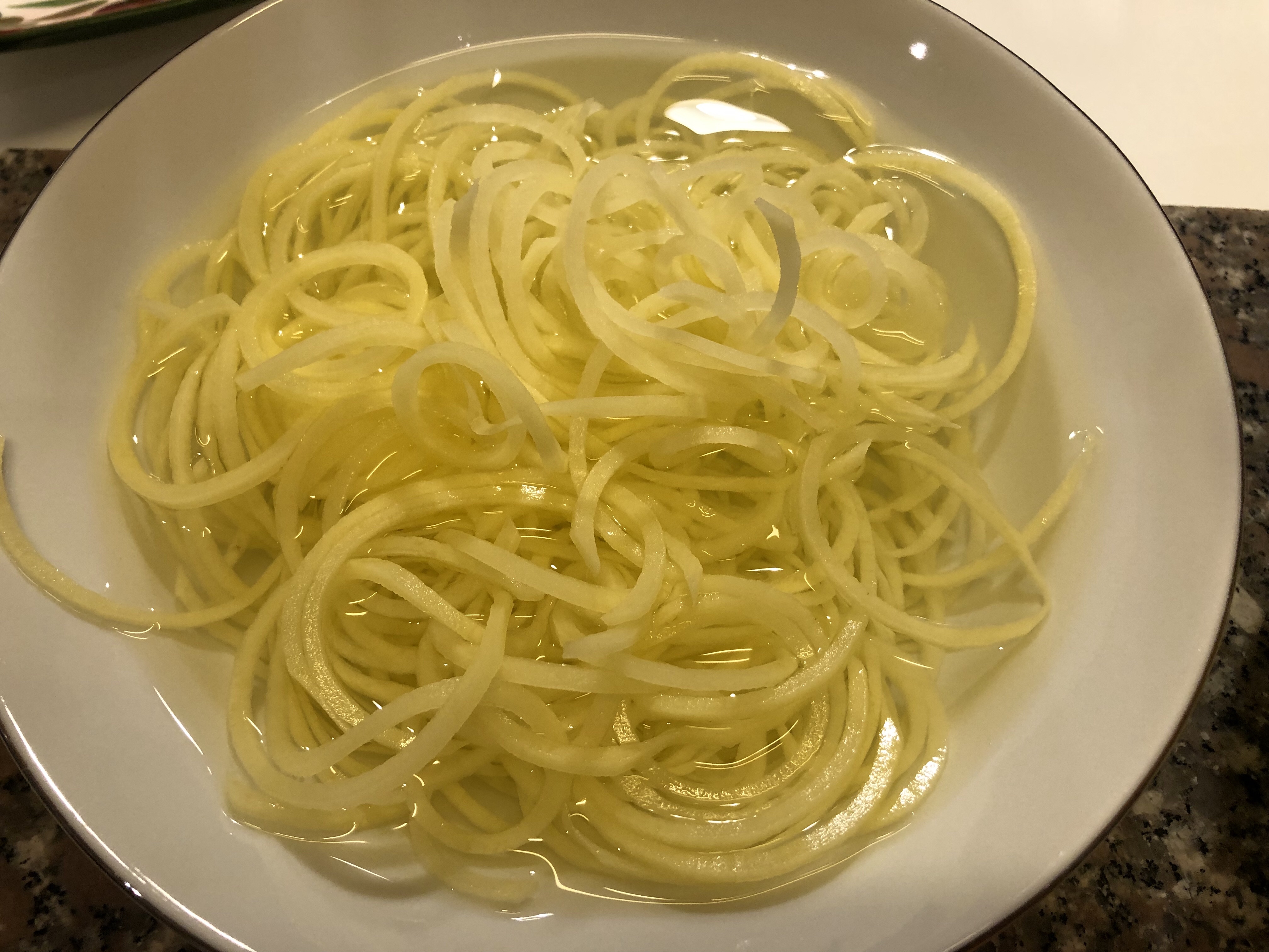 Sbuccio le verdure inizio con la patata che inserisco nella macchinetta, giro la manovella ed ecco gli spaghetti di patate