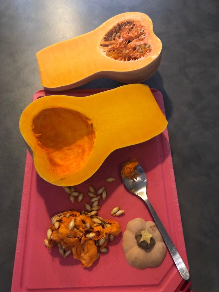 Pulisco la zucca la taglio a metà ed elimino i semi